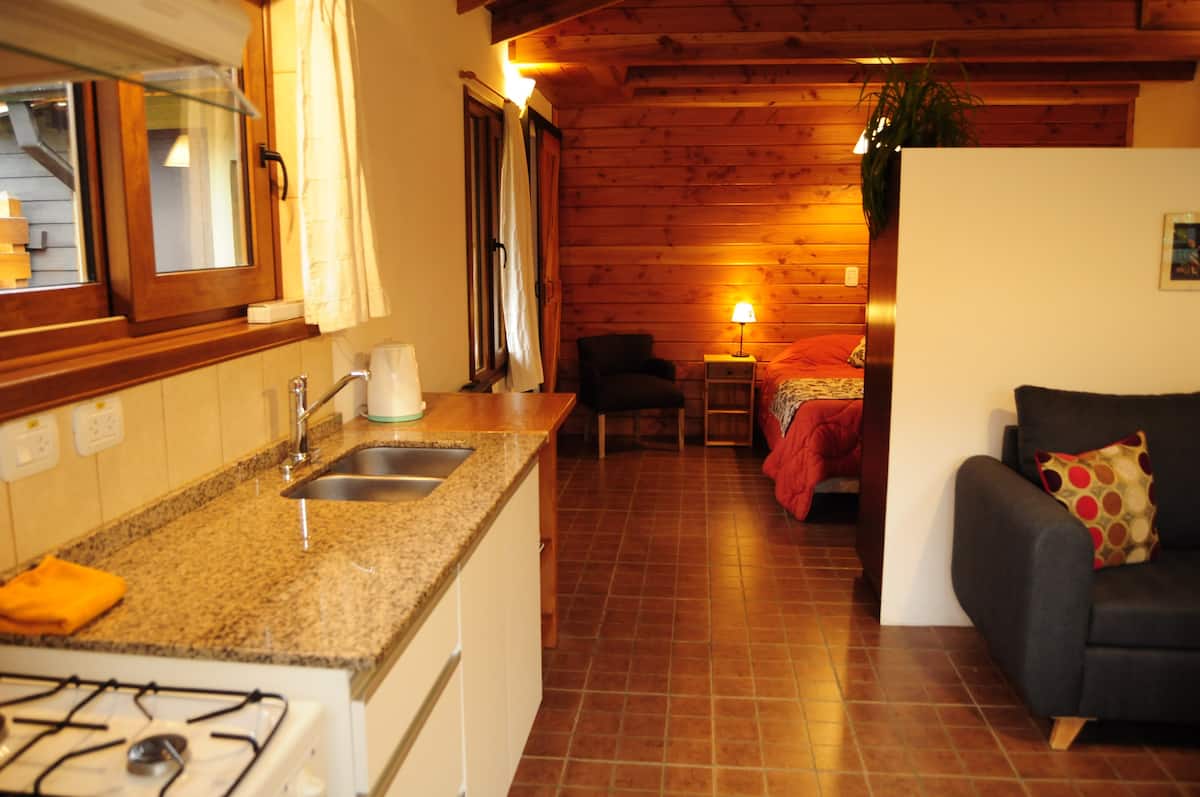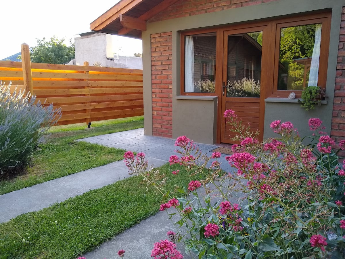 En el exterior, se podrá disfrutar de un jardín florido, y de la vista al cerro Piltriquitron. El mismo se comparte con la casa principal, habiendo un sector separado por una medianera de madera, que permite tener privacidad y disfrutar de la parrilla.